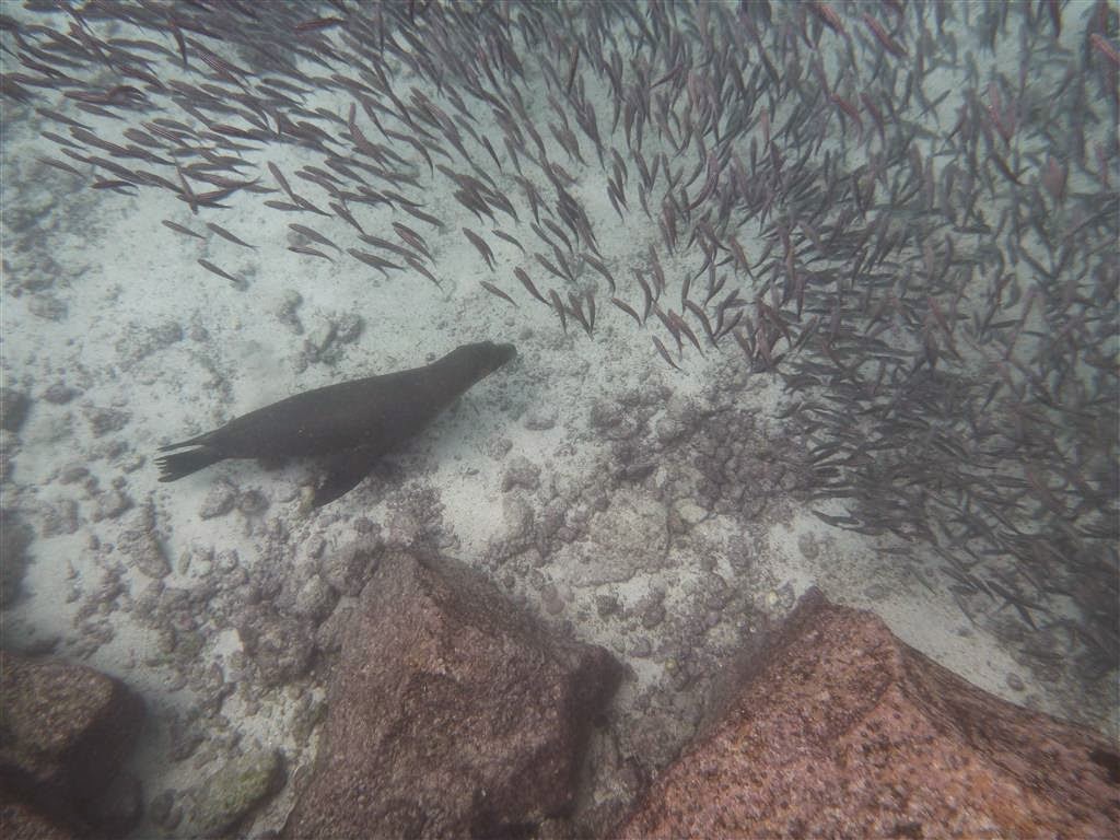 Back on board about 10.15ish, where we went up onto the top deck to grab a set of snorkelling gear and a wetsuit before our deep water snorkel – in off the zodiac. We saw heaps of fish, Sea Lions eating the fish, some Diamond Stingrays and a white tipped reef shark. We snorkelled for 30 minutes in very clear water along the shore of Santa Fe.